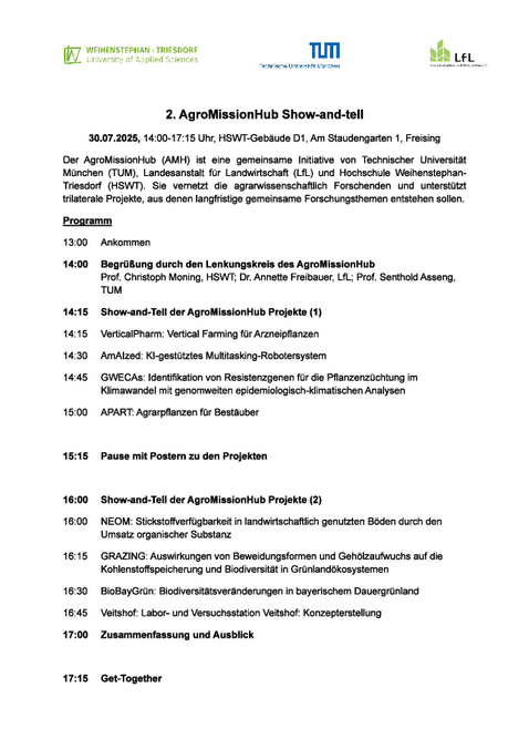 Die LfL, HSWT und TUM laden zur Vorstellung der Projekte im AgroMissionHub ein. Kommen Sie dazu, um mit den Beteiligten und Forschenden direkt ins Gespräch zu kommen und mehr zu agrarwissenschaftlichen Forschung in Freising zu lernen.